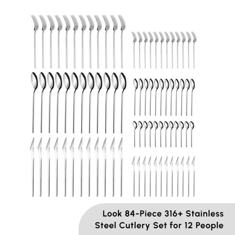 Karaca Look 84-Piece 316+ Stainless Steel Cutlery Set for 12 People, Silver