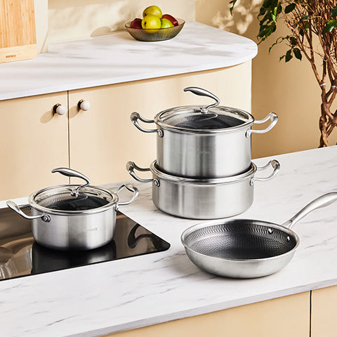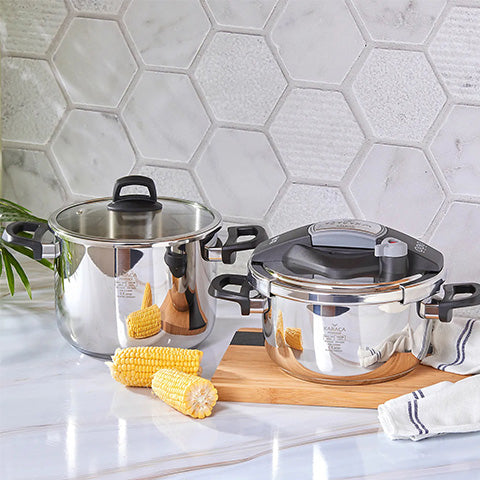 Karaca Emirgan XL 10-Piece Stainless Steel Induction Cookware Set with Storage Container, Silver Red
