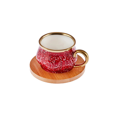 Karaca 12-Piece Bone China Espresso Turkish Coffee Cup Set with Bamboo Tray for 6 People, 90ml, Red Multi