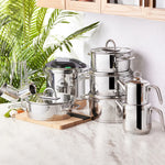 Karaca 17-Piece Stainless Steel Induction Cookware Set, Pressure Cooker, Turkish Coffee Pot Set with Stand, Teapot Set, Silver
