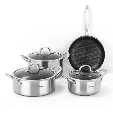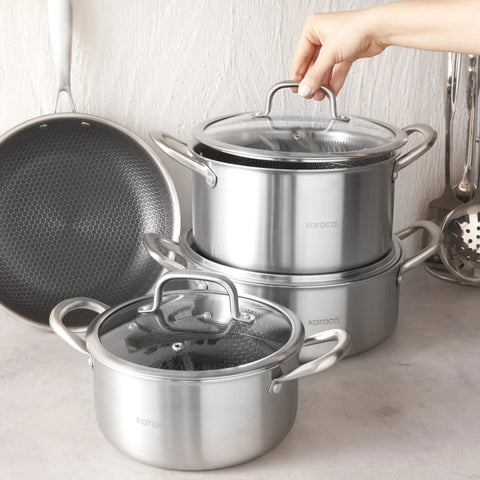 Designed with induction cooking in mind, this cookware set is suitable for use on induction hobs. The combination of inner 316+ stainless steel, middle layer aluminum, and outer induction steel ensures compatibility with induction heat sources. Enjoy efficient and even heat distribution for consistent cooking results.