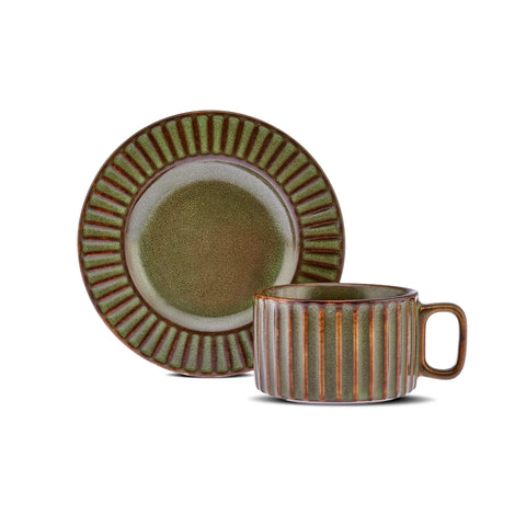 Karaca Cereus 4-Piece Ceramic Reactive Glaze Tea Cup and Saucer Set for 2 People, Green