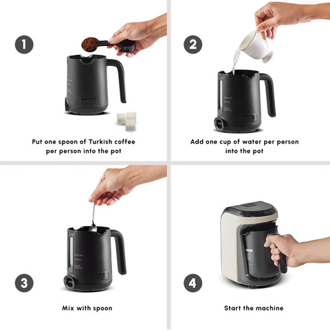 This Electric Turkish Coffee Maker is great for making roasted Turkish coffee, Turkish coffee with milk, hot chocolate with milk, and instant coffee with milk in ideal consistency. 5 cup capacity to serve your guests.