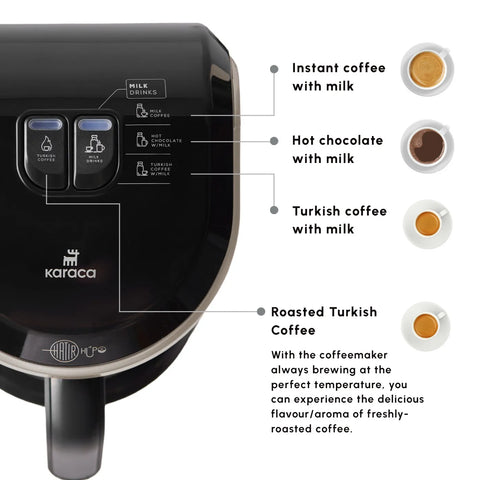 The maker brews coffee quickly and it is easy to use. The stainless steel body keeps the coffee hot for a long time. It brings out the intense flavour of the coffee and offers a richer aroma. Karaca Hatır Hüps Turkish Coffee Maker with Milk, prepares roasted Turkish coffee, hot milk chocolate and instant coffee at the right consistency and in the best possible time. It is left to you to enjoy the incomparably delicious taste of coffee Hatır Hüps Turkish Coffee Maker with Milk is the first device of its kind in the world that can prepare both roasted Turkish coffee and other delicious hot drinks with milk. The Hatır Hüps coffee maker, which prepares Turkish latte, hot milk chocolate and instant coffee with milk to the ideal consistency, heats the coffee and other beverages to the right level without burning them thanks to heat regulation. In addition, the smart sensor of the device is designed to prevent spilling drinks. The color selection suits any style, and the exceptional design takes up as little space as possible in the kitchen. Another reason for the popularity of Hüps Turkish Coffee Maker is its easy cleaning. This product should not be cleaned in the dishwasher. It can be cleaned with a soft sponge.