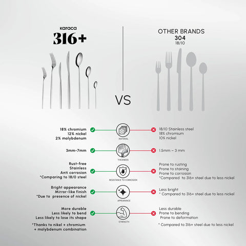 Karaca’s exclusive 316+ stainless steel sets a new benchmark in durability and longevity. Enriched with 18% chromium, 12% nickel, and 2% molybdenum, it is up to 42% stronger and 53% more resistant to corrosion and scratches than standard steels.