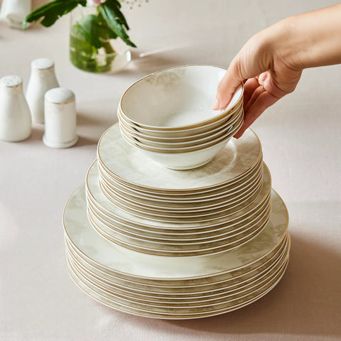The Siena plate set makes cleaning a breeze Our dinner set for 12 people guarantees a high level of hygiene thanks to its waterproof properties. However, it's important to note that the set is not suitable for dishwasher use due to its delicate composition.