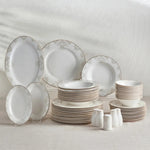 Immerse yourself in a lavish dining experience with 12 generously- sized 12 dinner plates (27 cm, 10.6”), 12 cereal bowls (14.3 cm, 5.6”), 12 dessert/side plates (19 cm, 7.4”), 2 elegantly - crafted salt shakers, 2 pepper shakers, one toothpick, 12 pasta bowls(21.5 cm, 8.4”), 2 small serving platters (20.4 cm, 8" and 14 cm, 5.5") and a large serving platter (30.5 cm, 12” and 21.5 cm, 8.4”). Designed for 12 diners, our Siena dinner set is perfect for family gatherings and special occasions.