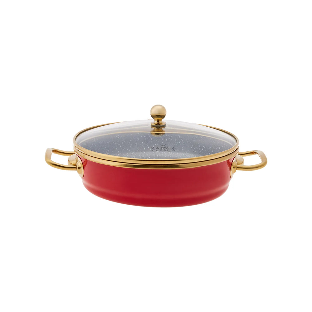Karaca Troy Enamel Induction Shallow Stock Pot with Lid, 20cm, Red Gold