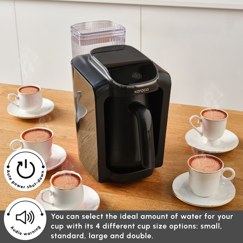 Enrich your coffee experience with the Karaca Hatır Aqua, now equipped with a built-in water tank for the ultimate convenience. This smart machine automatically draws water, ensuring the perfect brewing temperature and consistency for an authentic Turkish coffee experience. It can prepare up to five cups of Turkish Coffee or Sand Coffee at once. With Small, Standard, Large, and Double cup size options, it adapts to your needs while maintaining the ideal coffee-to-water ratio. The digital touch display lets you adjust the cup size easily, while the low water level alert ensures uninterrupted brewing. The Overflow Prevention System guarantees a spill-free experience, and once your coffee is ready, the machine notifies you with sound and light signals before switching off automatically. With its sleek, modern design, a range of colour options, and features that enhance the traditional Turkish coffee experience, the Hatır Aqua is the perfect companion for coffee lovers.