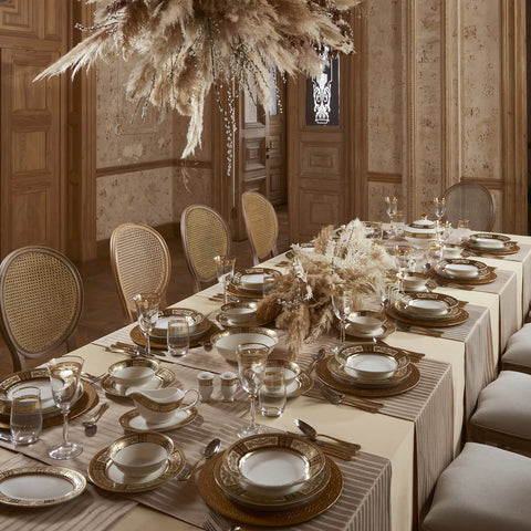 Weimar Porzellan represents a (piece of) centuries-old German heritage, visualising the bold ideas of the time rendered possible thtough impeccable craftsmanship. Brought to life through tradition and experience, the porcelain used in the collection tells a story in its every design, combining German cultural heritage, elegance, nobility and timeless beauty. It reflects the finest gold accents of Baroque art, the splendid line of relief patterns, the special touch unique to the palaces. The striking motifs created by the hands of master craftsmen, combined with today's modern and noble white porcelain texture, pass on the splendour of the palace from generation to generation. Weimar Porzellan products, which fuse sparkling golden touches and patterns, display flawless appearance which project a reflection of luxury and splendid brilliance with the layered effect of its high-embossed, decorative (decal) patterning/designs.